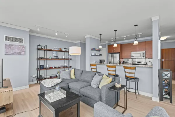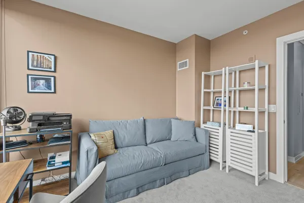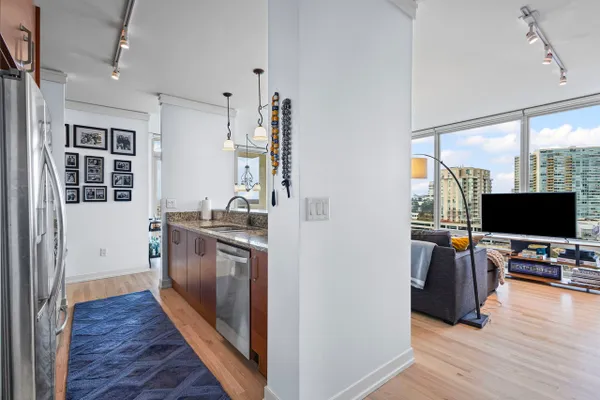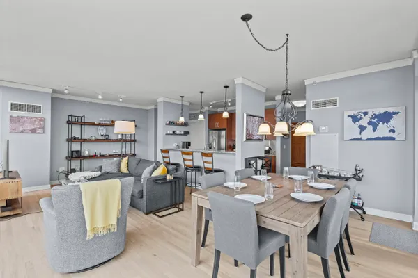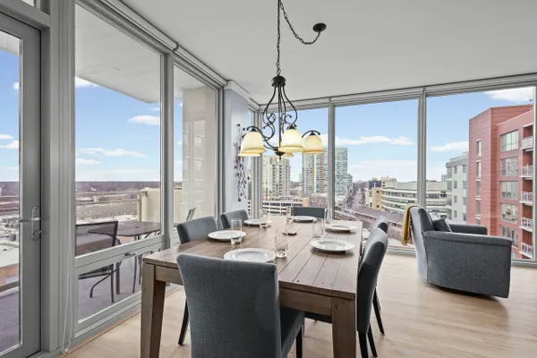 Beautiful views for days from this high floor unit corner unit in One Evanston. With 9' ceilings wrapped in windows, the spacious living area features an open kitchen, separate dining area, a large outdoor space, and an office nook - this 1349sf upgraded home does not disappoint! The open kitchen offers cherrywood cabinets, granite counters, stainless appliances and a large reach in pantry. The primary suite offers two organized closets and a luxuriously sized bath with separate tub/shower and long vanity with loads of storage and double sinks. The second bedroom is presently converted to an office den with built-ins but can easily be restored to a large reach in closet. Custom blinds throughout and freshly refinished light oak floors throughout the main living areas. Two indoor parking spots and storage are included. One of Evanston's Premiere full amenity buildings offering an indoor lap pool with jacuzzi, and well-appointed workout room including Peloton bikes. The large community room features a full kitchen and opens to an expansive outdoor sundeck with grills. Door and expert maintenance staff, secure bike room, and guest parking complete this luxury experience. Peaceful downtown living with convenient access to Metra and CTA, Northwestern University, shops, restaurants and the lakefront.